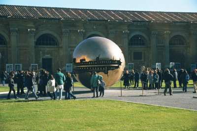 We began our tour in the Courtyard of the Pine Cone (photo above). All of the buildings that today make up the museums were at one time or another the apartments of the popes. Today, the museums of the Vatican comprise one of the most valuable collections of art in the entire world. We toured a number of rooms and hallways and saw many wonderful masterpieces. However, I captured very few photographs. The photo below was of the ceiling of a very long hallway. Our guide pointed out that even though the art work on the ceiling appeared to show at least several inches of relief, it was actually, a totally flat painting. The other photograph is of the beautiful "Sphere within Sphere" by Arnaldo Pomodoro commissioned by the Vatican in 1990.