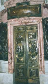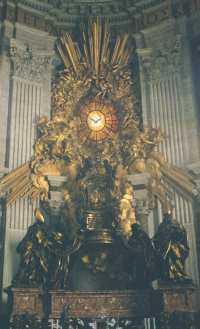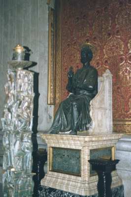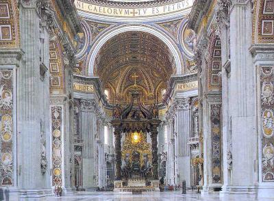 The Sistine Chapel is the Pope's private chapel. It is also the place where the Cardinals gather after the death of a pope to select the next pope. The ceiling was painted by Michelangelo under contract by Pope Julius II in 1508 and was completed on November 1, 1512. It tells the entire story of Genesis and focuses on the Creation of Adam in its center. The front wall of the chapel features Michelangelo's - Last Judgment.   Christ ordered Peter to guide the Church throughout history. As a result, Peter came to Rome in about 42 A.D. Then sometime between 64-67 A.D., at the height of of the anti-Christian persecutions, Saint Peter was martyred (crucified upside down) in Nero's Circus at the foot of Vatican Hill. His body was entombed in a nearby burial ground. Peter's tomb is the reason for all that exists in the Vatican to this day.