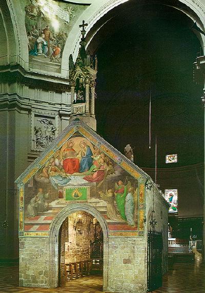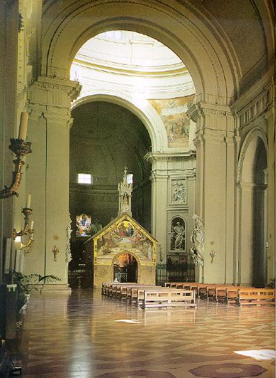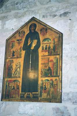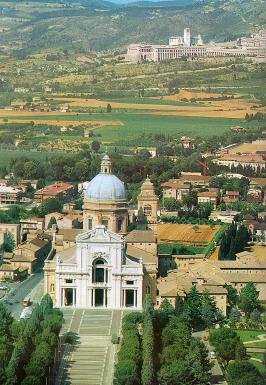 On Tuesday morning we boarded the bus for a 2 1/2 hour drive north of Rome to Assissi. The drive was beautiful. In the distance off to the east, we could see a beautiful range of snow capped mountains. On either side of the Autobahn we got a chance to view the beautiful green countryside of the "back of the boot". Also, during the bus ride Linda Clancy led a rosary for the entire group. As you can see from the photo at the top of this page, the city of Assissi is divided between the ancient city on the top of the hill and what they referred to as lower Assissi next to the highway. The church on the top of the hill is the Basilica of St. Francis. The church in the foreground is the Basilica of Santa Maria degli Angeli