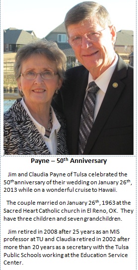 | Jim and Claudia Payne were married on January 26, 1963 in the Sacred Heart Catholic Church in El Reno, Oklahoma. We were both 18 years old and most people that attended, probably gave our marriage very little chance of success. We were just too young to know what we were doing! However, God had different plans in mind. He gave us three wonderful children - David in December of 1963, Lauri in September of 1966, and Michael in March of 1973. They in turn have given us seven truly exceptional grandchildren. Tyler-22, Kyle-21, Hailey-20, Blake-19, Nathan-18, Madeline-11, and Andrew-9. Last week, as a surprise anniversary gift our kids and grandkids presented us with these two professional photographs. There is no way they could have given us anything more precious. Thanks to each of you from the bottom of our hearts! Then, to celebrate our 50 years together, we took a two week cruise to Hawaii and back. It was absolutely AMAZING! We both hope that you will enjoy visiting our site! |